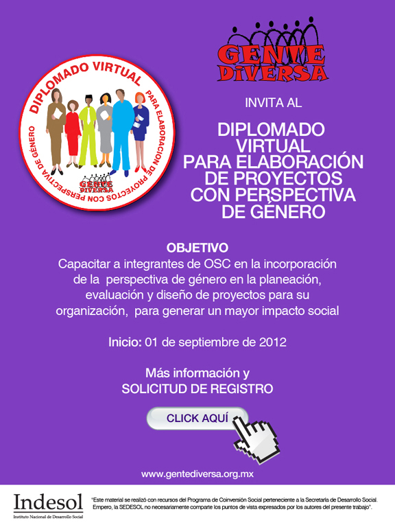 Invitación al Diplomado Virtual para Elaboración de Proyectos con Perspectiva de Género Tweet Hola a todas-os:Estamos promoviendo en Gente Diversa, un Diplomado Virtual para la elaboración de Proyectos con perspectiva de género, los-las invito a que revisen la propuesta y se registren!